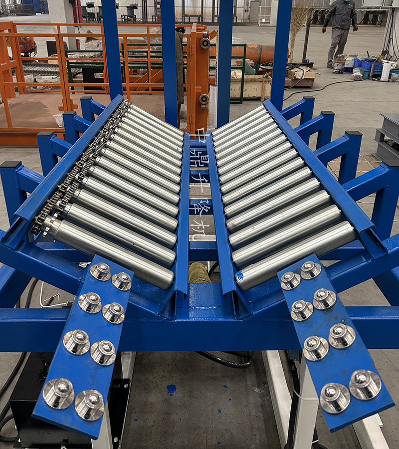 设备名称:带辊轮输送带的翻转机设备参数:翻转平台尺寸1500*1200+1200*1100mm(一个平台面做成V型动力辊道线,另外一个平台面做成梳齿状)