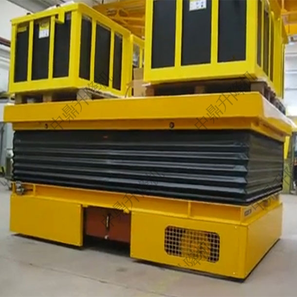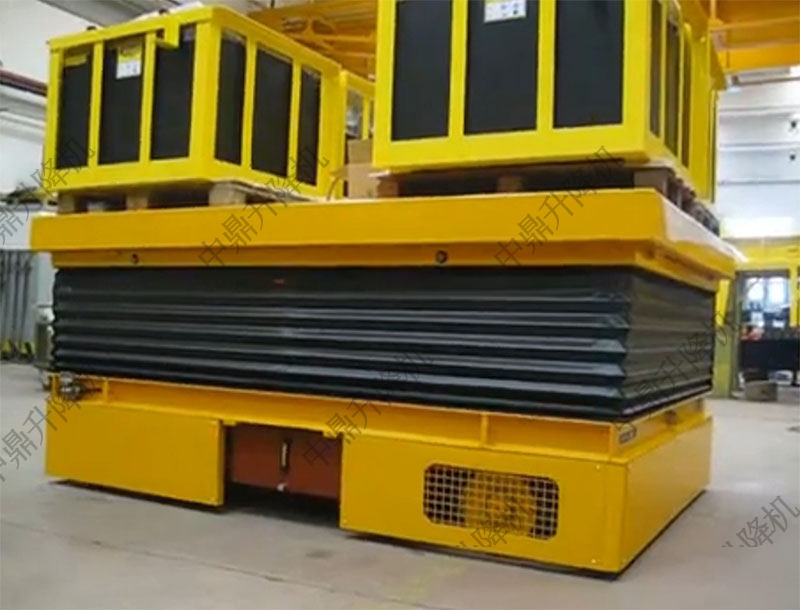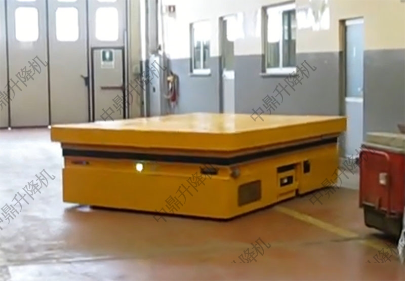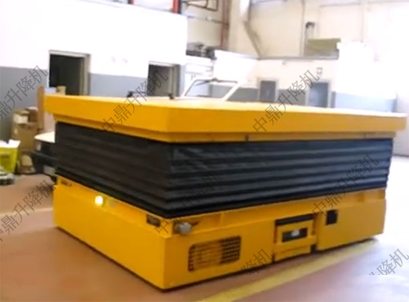 这是一款额定载重10吨的AGV升降运输车,采用醒目的黄色工业涂装,配备风琴式防护罩,可有效隔绝粉尘、碎屑,保护内部升降结构。