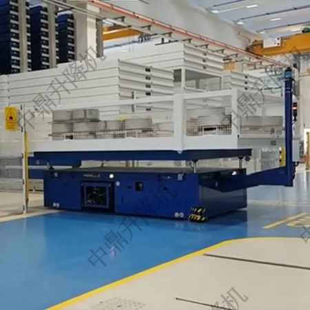 这是一款15吨全向AGV,配备麦克纳姆轮和升降平台,专为存储大型和重型物料的自动化仓库设计。